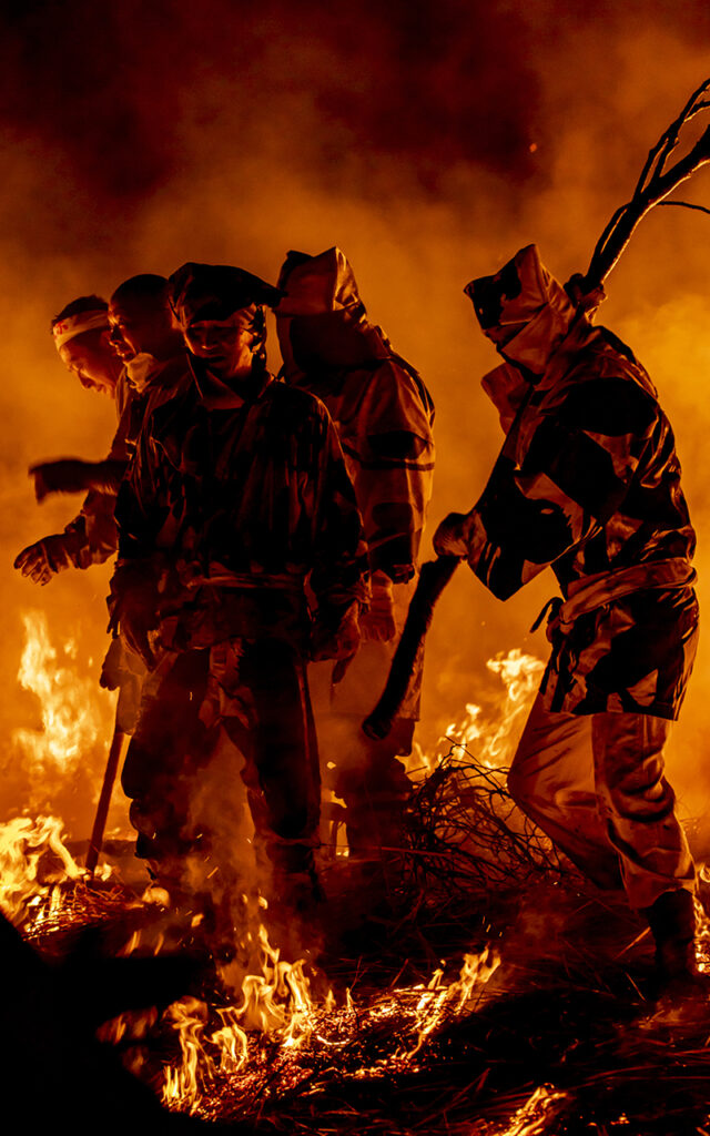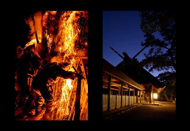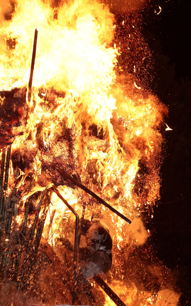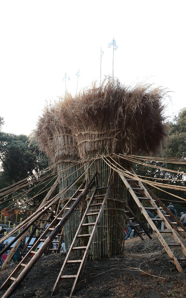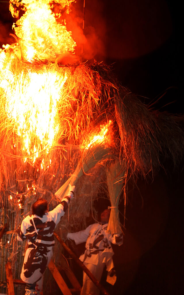 A large, 7-meter-tall torch made of bamboo and thatch called "suzumi" is lit. The Miyanishi River divides the area into two regions, "Kanji" and "Fukuji," and the leading "kamiotoko" (divine men) from each region purify themselves in the cold sea with their attendants. Then, donning costumes made from old flags called "neko," they bravely jump into the blazing flames, retrieve the sacred tree and twelve ropes from within the suzumi, which they then offer to the altar.